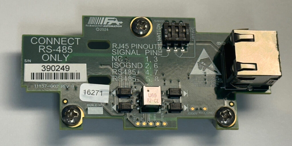 This expansion card can be added to any Chameleon+ analog or discrete module to give the module one RS-485 serial port for communications. The module supports Modbus ASCII, Modbus RTU, FairNET, Custom ASCII, and Custom Binary communication protocols. It also includes onboard (selectable) network termination and biasing.
